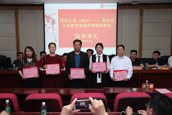据悉,4月21日上午,该培训班举行了第二届“湘师论坛”,贾腊生主任作了《教师核心素养及提升研究》的主题讲座,下午两点半举行了“未来教育家之树”揭牌仪式等相关活动。