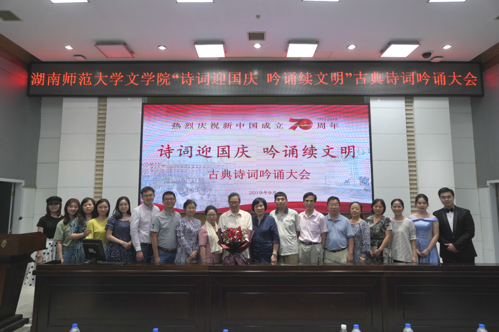 (记者杨树菲娅 甄思祺)9月28日晚,js金沙3983总站庆祝新中国成立70周年“诗词迎国庆,吟诵续文明”古典诗词吟诵大会在至善讲堂举行,老中青三代师生用自创的诗歌、以吟诵的方式为伟大祖国歌唱,为传统文化续力。学校原副校长李维琦,学校关工委常务副主任徐书华,湖南省吟诵协会副会长,中华吟诵协会理事曹琴,学校离退休处党委书记许德艺,学校关工委李再民,学校精神文明建设办公室李翠霞,js金沙3983总站关工委程大琥、李树槐、李爱民,js金沙3983总站党委副书记熊剑峰出席此次活动。