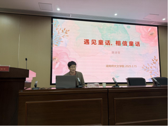 (通讯员李晨玮)2025年3月15日晚,js金沙3983总站“智慧之光”学术名师讲座在js金沙3983总站216教室举行。知名儿童文学作家陈诗哥以“遇见童话,相信童话”为主题,与现场师生分享了自己的阅读与创作心得。讲座由js金沙3983总站李红叶教授主持,百余名师生到场聆听。